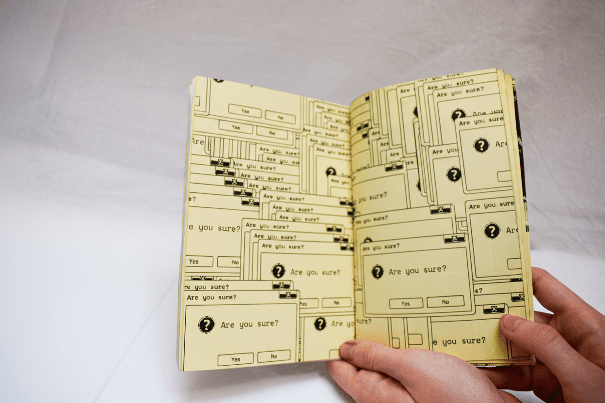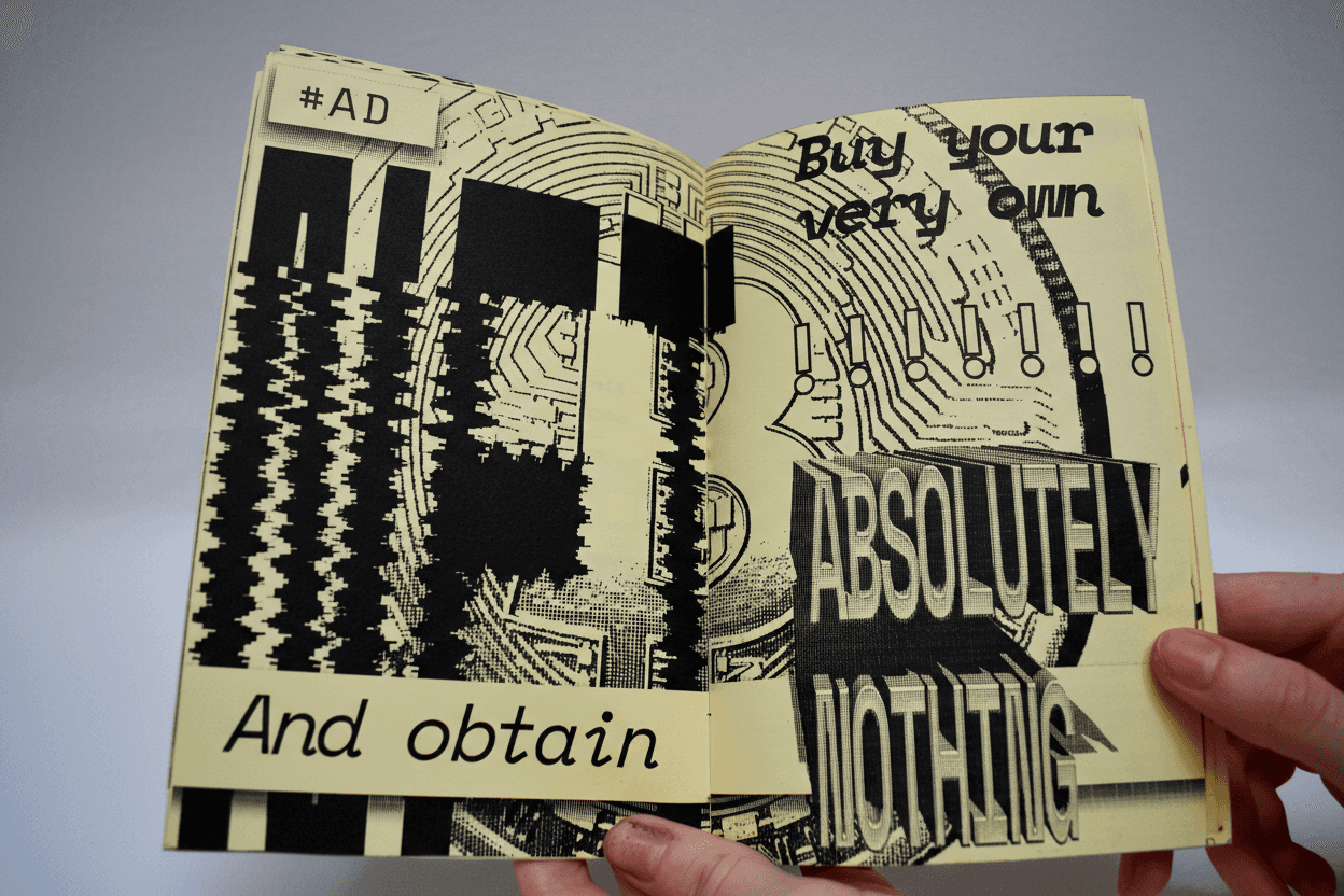R=^L1TY? is an experimental fanzine that explores how humans interact with digital media. It features a curated collection of single- and double-page compositions printed in black ink on bright yellow paper and acetate. More than just a visual experience, the zine includes interactive elements and hidden details waiting to be discovered by those observant enough to find them...